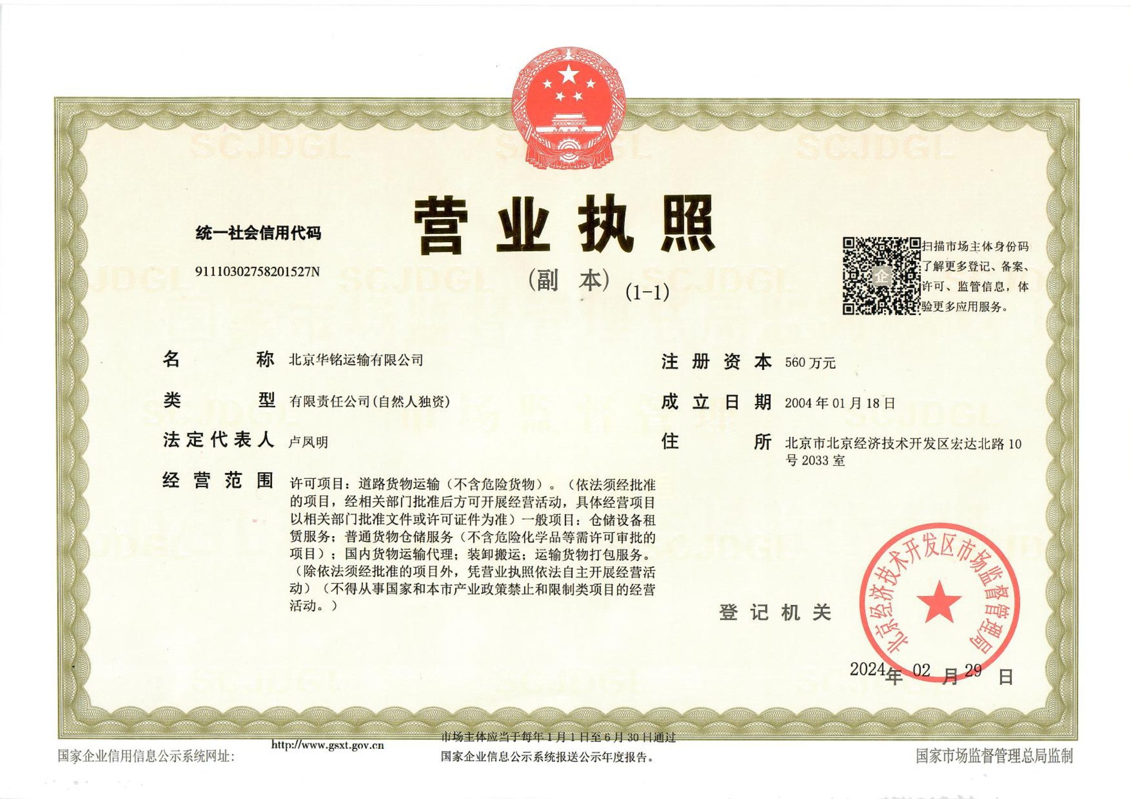 北京華銘運(yùn)輸有限公司,于2004年經(jīng)北京市工商局批準(zhǔn)注冊(cè)的有限責(zé)任公司(自然人獨(dú)資),注冊(cè)資金4560萬(wàn),總部位于北京,服務(wù)范圍遍及中國(guó)大陸地區(qū),核心業(yè)務(wù)包括物流運(yùn)輸,倉(cāng)儲(chǔ),包裝及供應(yīng)鏈解決方案,為各行業(yè)、各類(lèi)型商品、輔助品、半成品及原材料提供高品質(zhì)的專(zhuān)業(yè)物流服務(wù)。